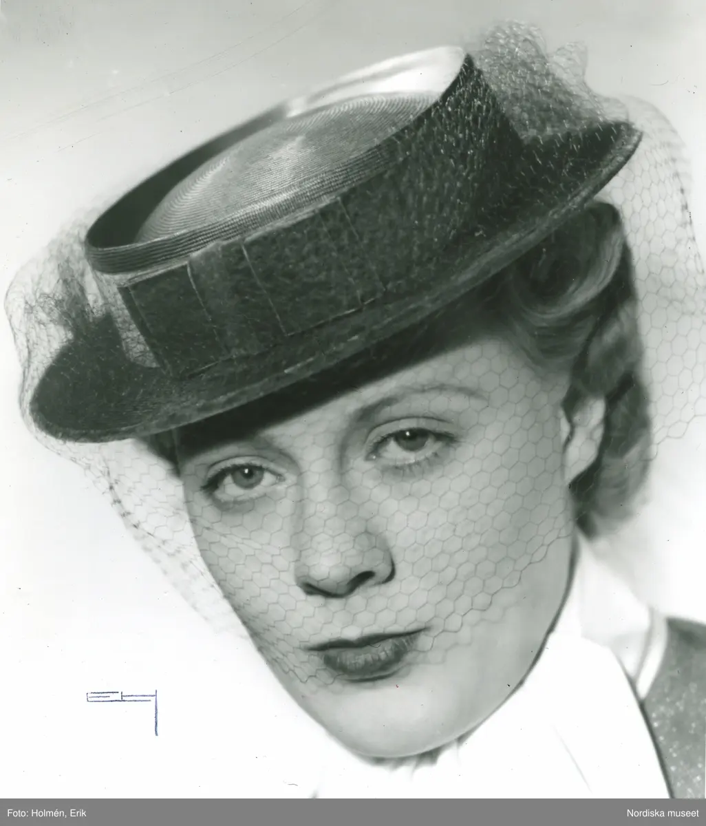 Fb, Porträtt av kvinna i hatt Madame Suzy. Stråhatt, grön balibuntal, grönt sammetsband, flor i rost.
