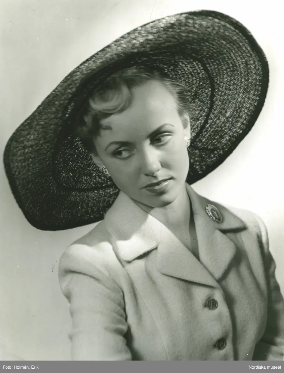 Porträtt av kvinna i bredbrättad stråhatt.