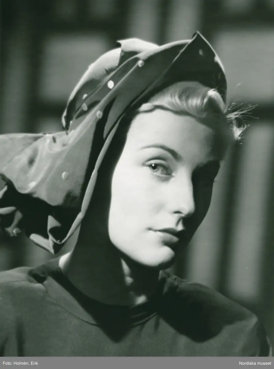 Porträtt av kvinna i hatt sydd av ljust marinblått failleband med vita påstickade prickar, av Claude St Cyr.