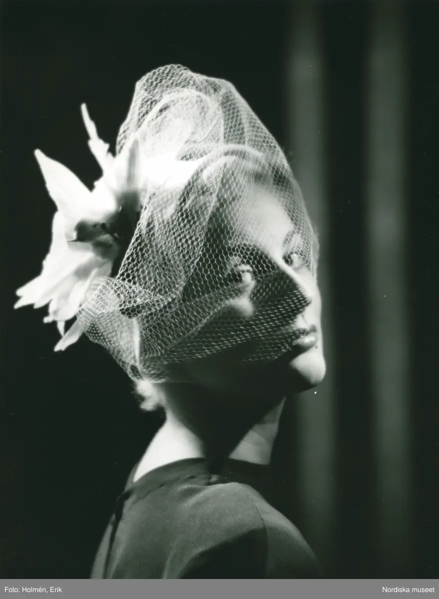 Porträtt av kvinna i hatt av Claude St. Cyr. Vit cloche av grosgrainsiden med fåglar och bär.