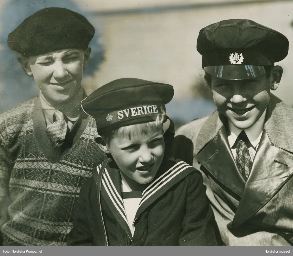 Skolungdom, pojken längst till vänster i tröja, skjorta, slips och basker, pojken i mitten i sjömanskostym och skärmmössa, pojken till höger i skjorta, slips, kavaj och skärmmössa.