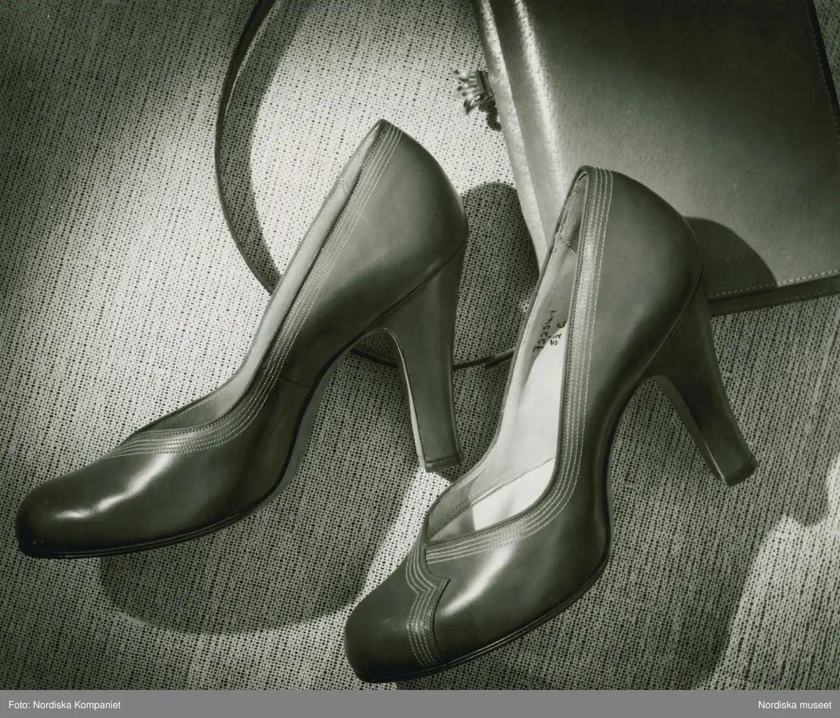 Skinnpumps med hög klack, mönsterstickning. Handväska.