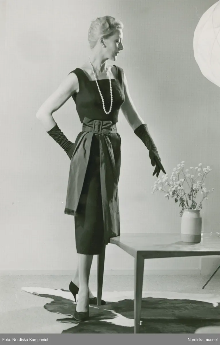 Mönster NK-Stil. Modell i klänning med skärp, pärlhalsband, handskar och pumps, vid en blomvas på ett bord. Kjolen - dräktens kjol (mönster B) Livet - aftonklänningens (mönster D)