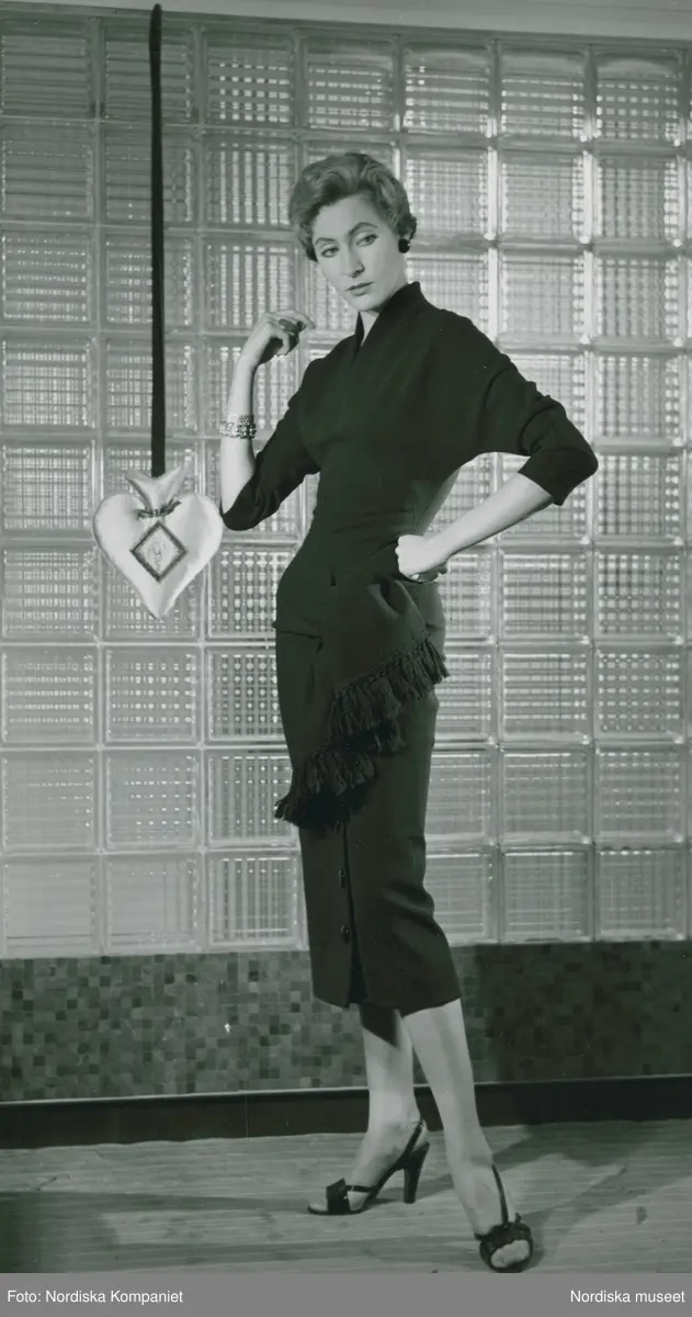 Modell i klänning med sjal runt höften, armband och högklackade skor, vid ett hängande hjärta. Betongglas i bakgrunden.