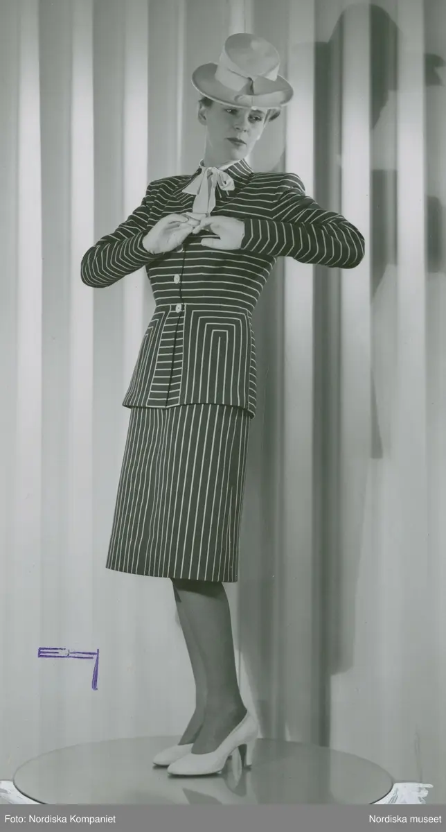 Modell i randig dräkt, rosett i halsen, hatt med hattband, handskar och pumps. Vår.