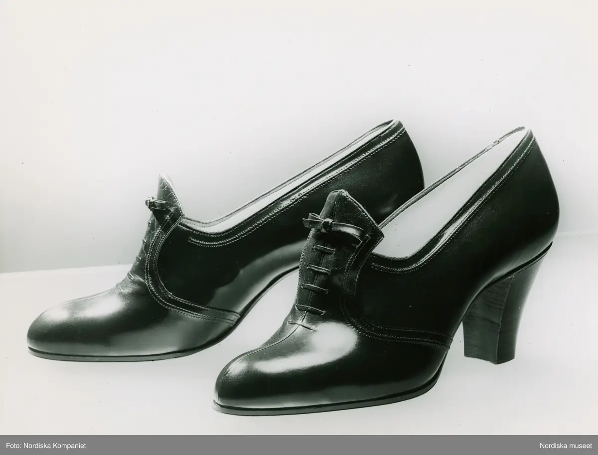 "Promenadskor av Mode-kalv, ett mjukt kalvskinn med cheuvreaubehandling, höga militärklackar av läder".