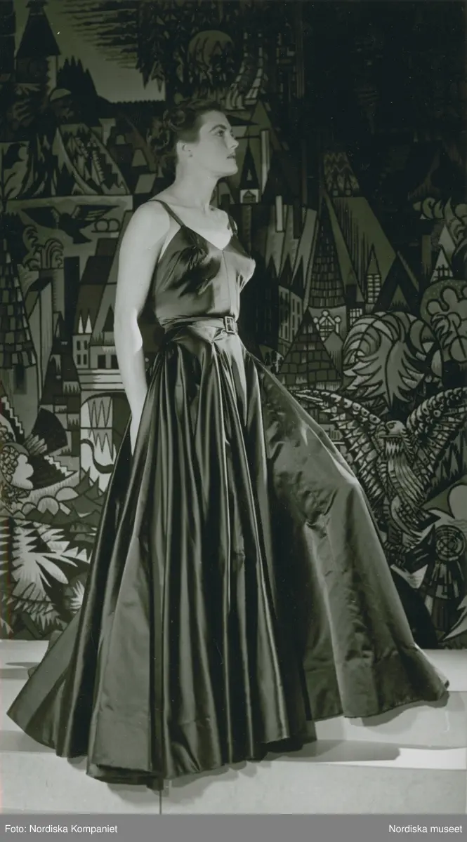 Modell i mörk aftonklänning i siden med tunna axelband. Textilkonstverk i bakgrunden.