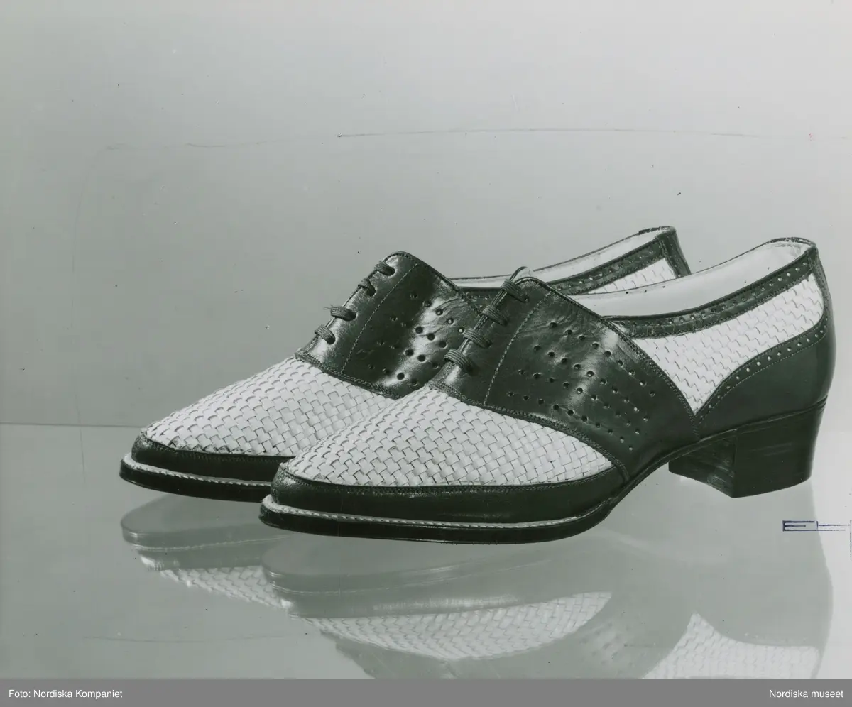 "Sommarskor. Sommarsportskor av vitt flätat skinn. Brun garnering. Låg klack".