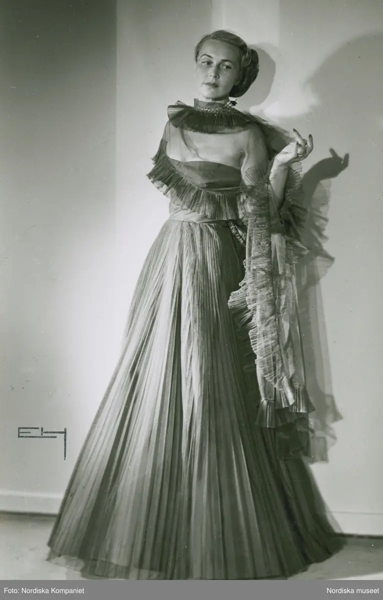 Modell, möjligen Hjördis Grundel-Starenius, i hellång klänning med plisserad kjol och sjal i tyll med plisseér, från Dior.