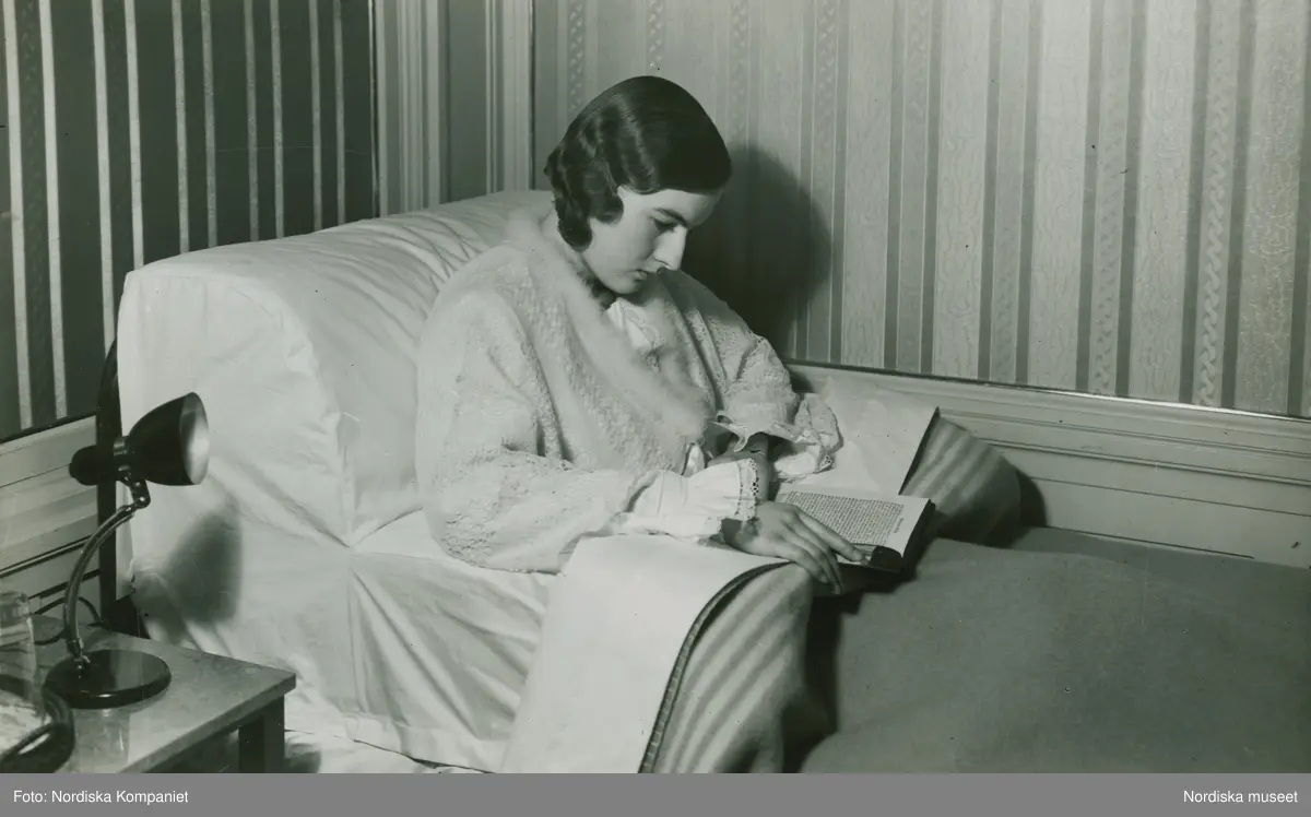 Modell i nattlinne med spets och virkad överdel med pälskrage, sitter i en säng och läser en bok.