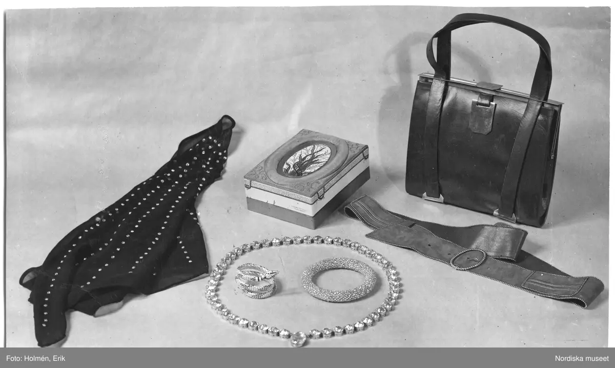 Kollage av accessoarer. Väska, skärp, smycken, ask och sjal.