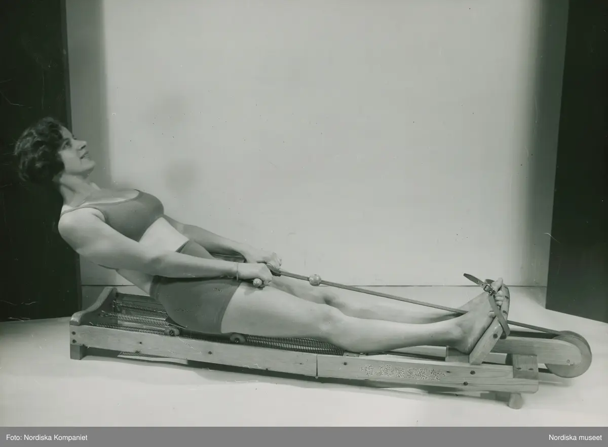Kvinna i tvådelad baddräkt tränar i en roddapparat. Nordiska Kompaniet. Text med blyerts på baksidan: " D F Roddapparat"