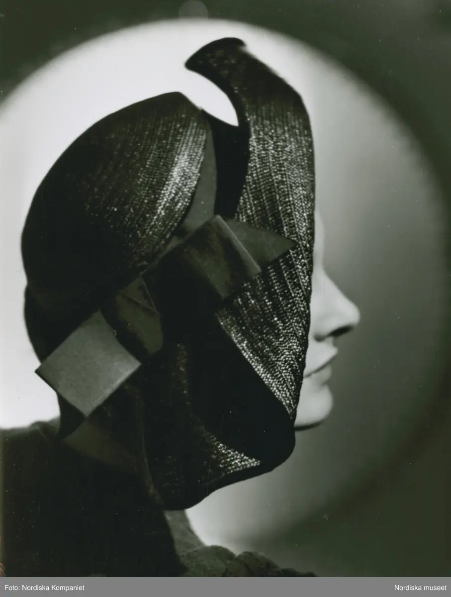 Porträtt av modell i stråhatt med ripsband, cirkelformad ljusskugga i bakgrunden. Av Gilbert Orcel.