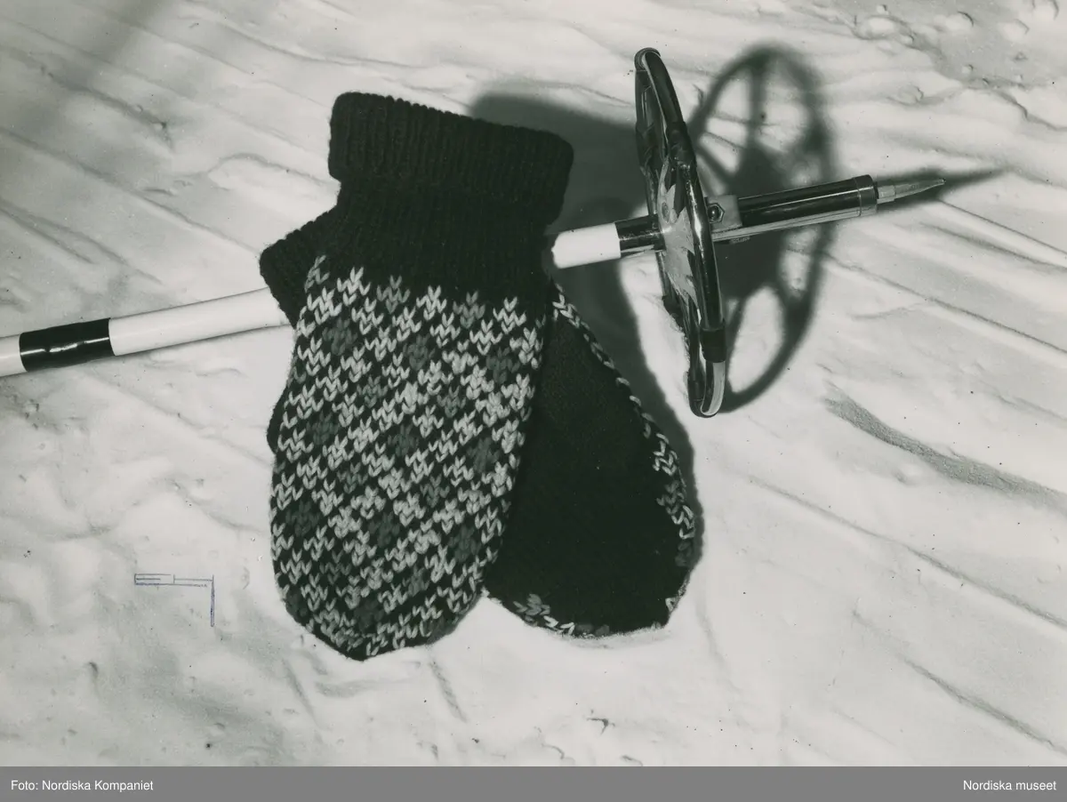 Ett par stickade vantar och en skidstav. Nordiska Kompaniet. text med blyerts på baksidan: "EK Damsportkläder div."