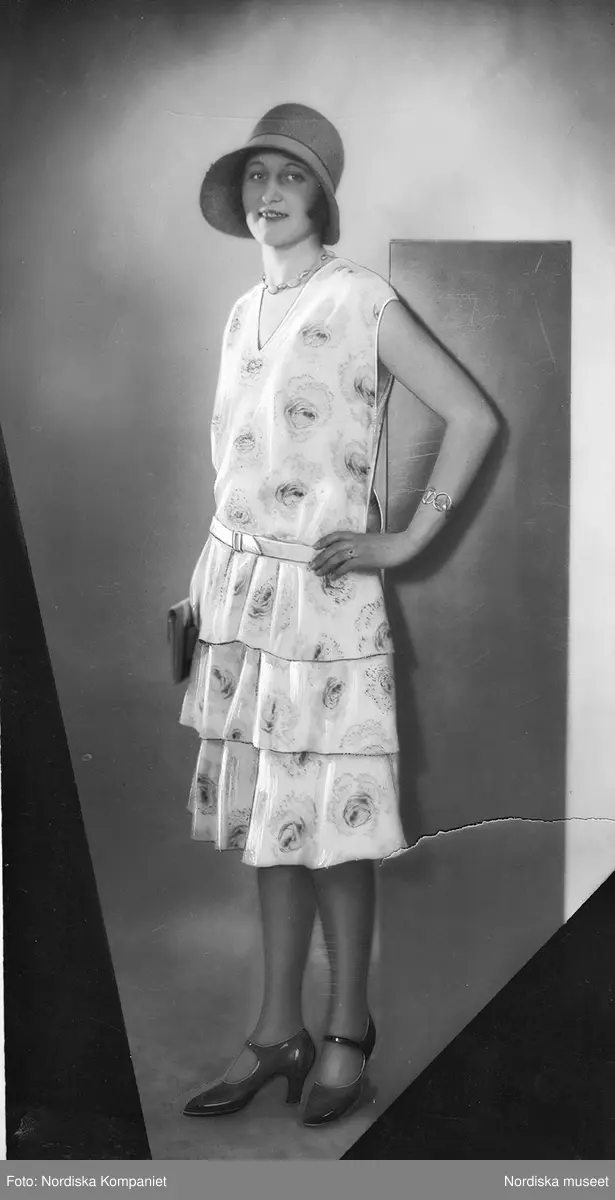 Modell i klänning med rosenmotiv, klockhatt och kuvertväska.