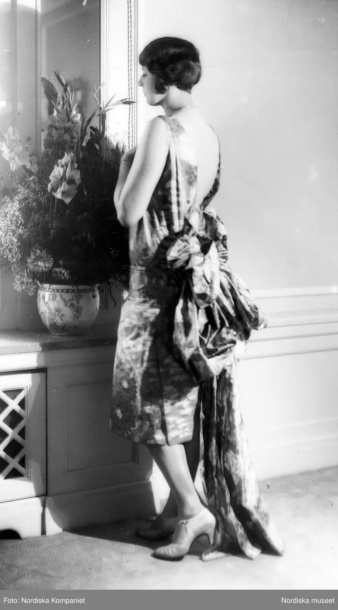 Modell i blommig taftklänning med stor rosett och litet släp baktill, vid ett fönster med blomsterarrangemang. Från Louise Boulanger.