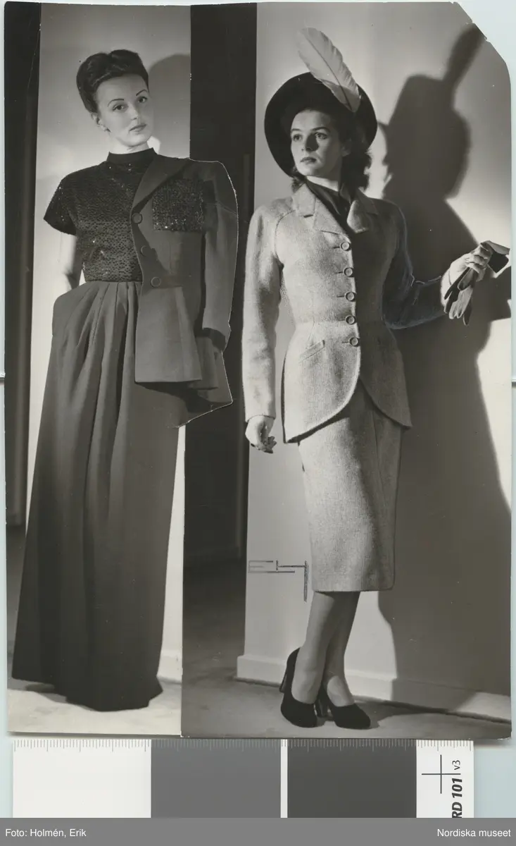 Nordiska Kompaniet. Montage. En kvinna i mörk aftondräkt, en annan i ljus dräkt. Text på baksidan "Balenciaga". Se NMA.0069022 och NMA.0069025.