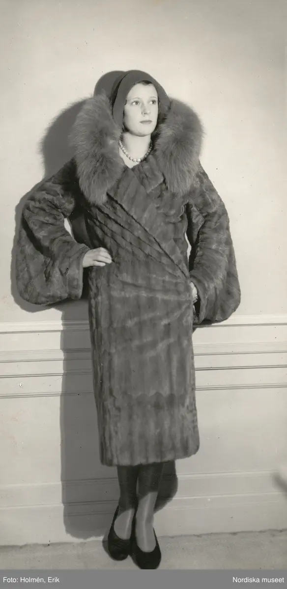 Nordiska Kompaniet. Kvinna i päls och hatt. Stor krage av avvikande päls. Text på baksidan: "Färgad hermelin med infärgad räv".