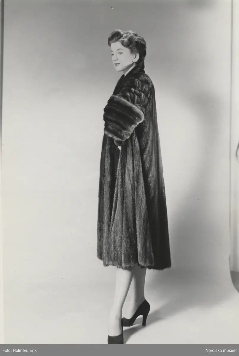 Nordiska Kompaniet. Kvinna i mörk päls. Text på baksidan: "Okt 1952"