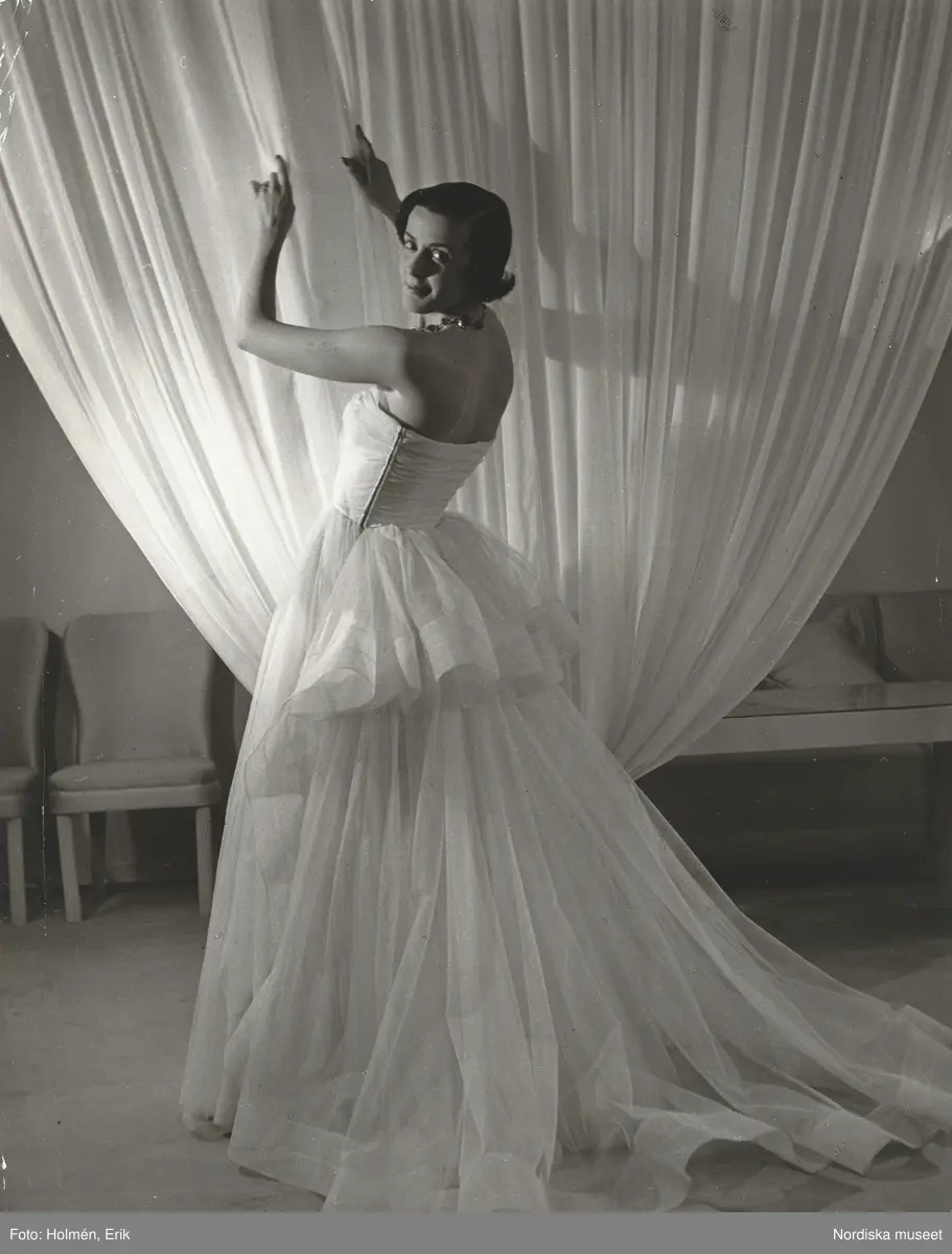 Nordiska Kompaniet. Kvinna i vit aftonklänning med bara axlar. Text på baksidan: "Vit tyll med turnyr från NK:s egen ateljé. Mars 1950"