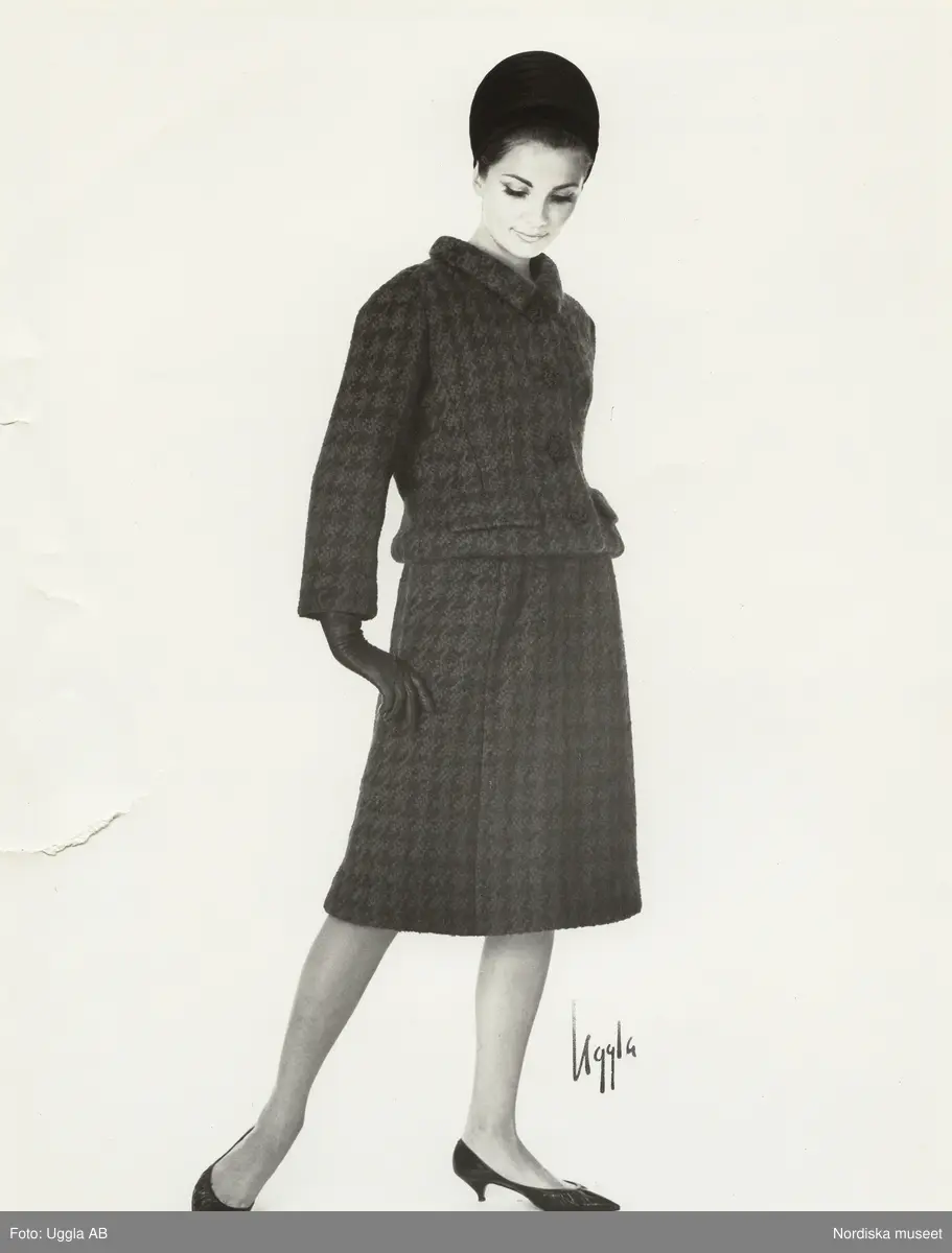 Modell i rutig tweeddräkt, hatt handskar och pumps med taxklack. NK:s Franska damskrädderi, från Courrèges. (Svårtydd text på baksidan av fotot.)