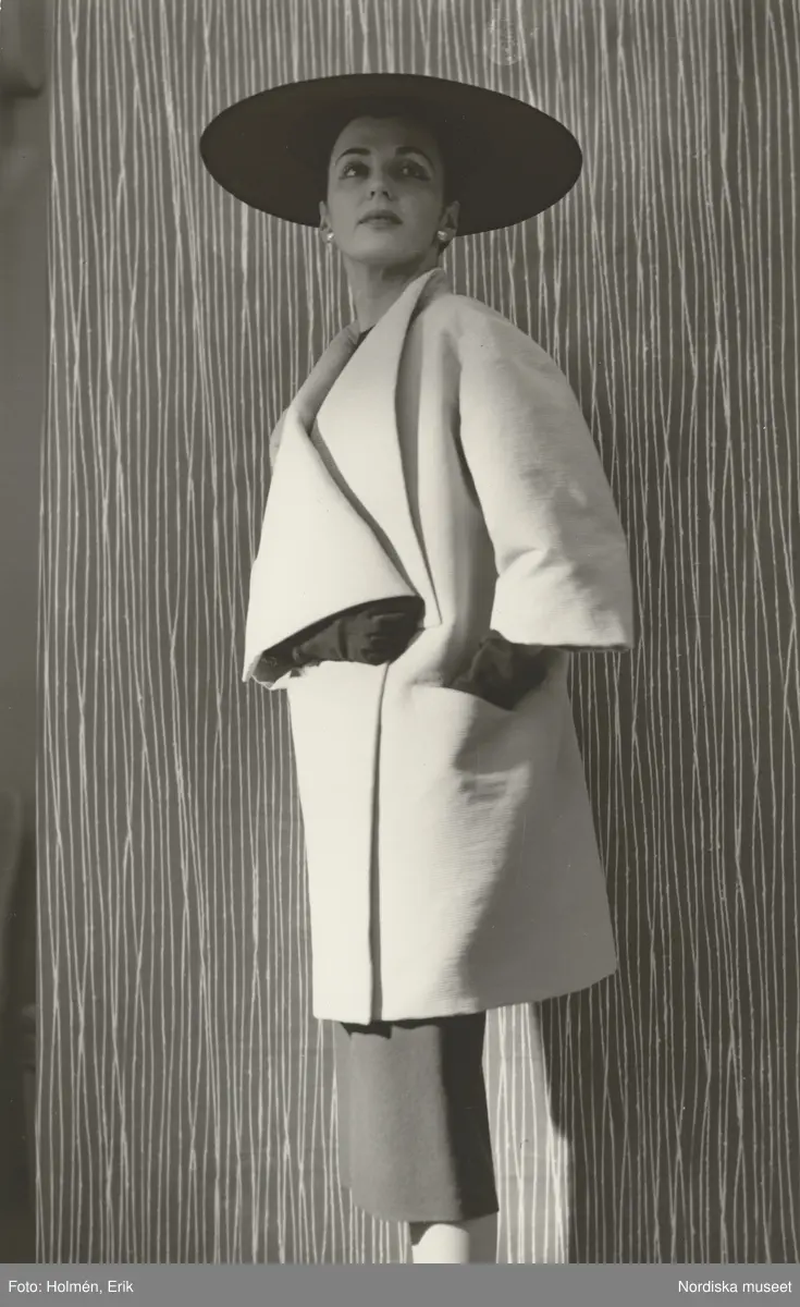Modell i ljus kappa, bredbrättad hatt och handskar.