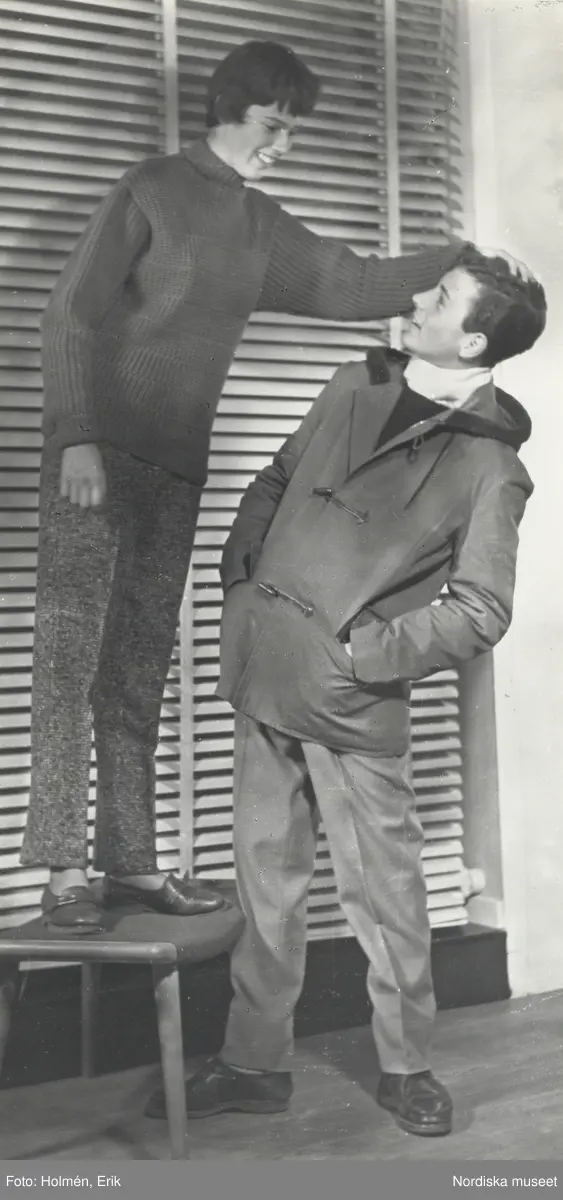 Tonårsmode. Tjej i polotröja och byxor på en pall, håller handen på mans huvud, klädd i duffel och byxor.