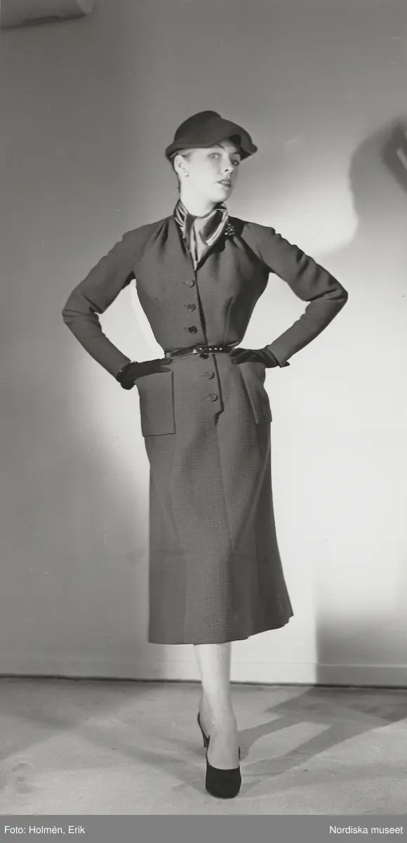 Modell i klänning med skärp, hatt, scarf och handskar. Från Dior.