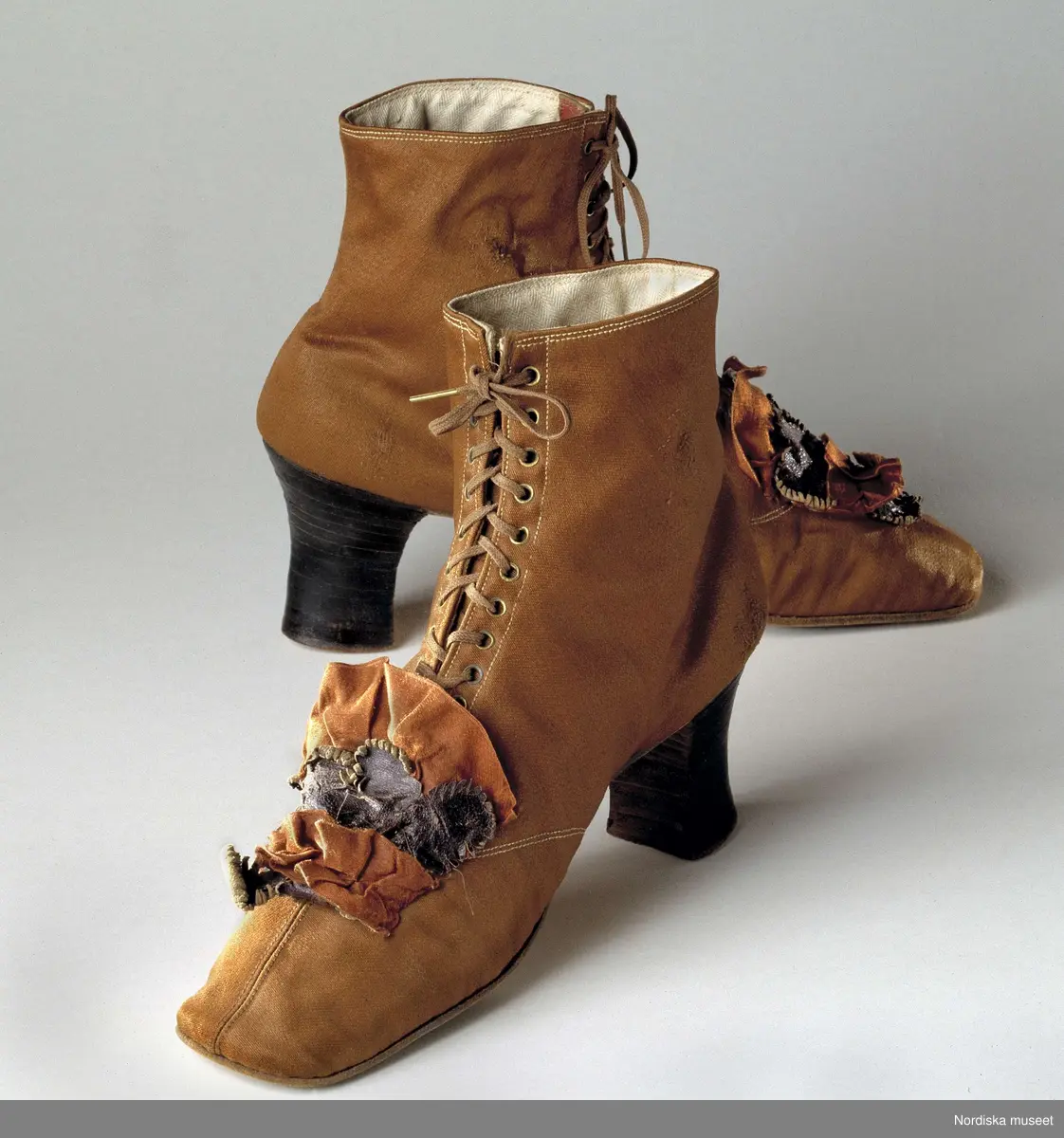 Damskor, snörkängor med senare tillagda klackar och rosetter. Ca. 1860-90-tal. Nordiska museets föremål inv.nr 219843.