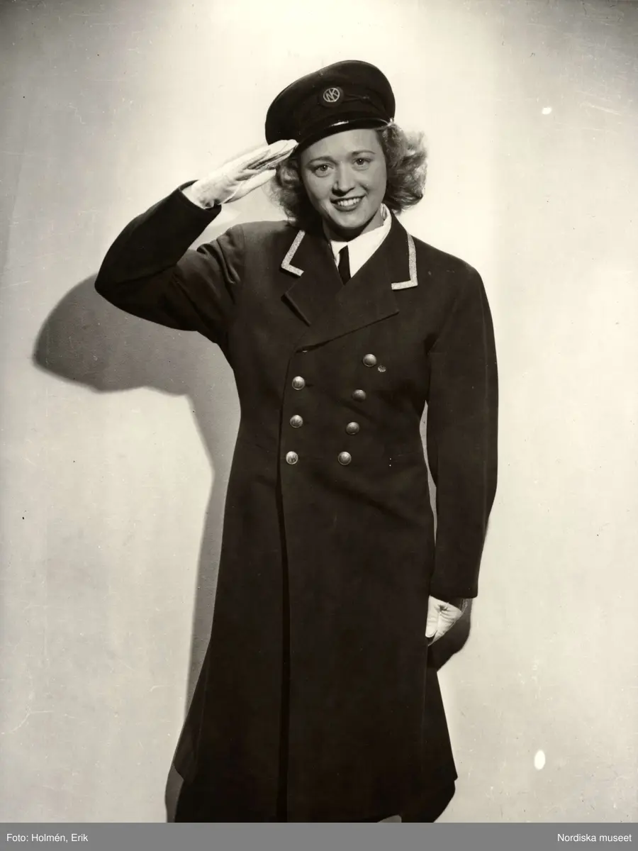 Kvinna i NK-uniform gör honnör. Nordiska Kompaniet i Stockholm.