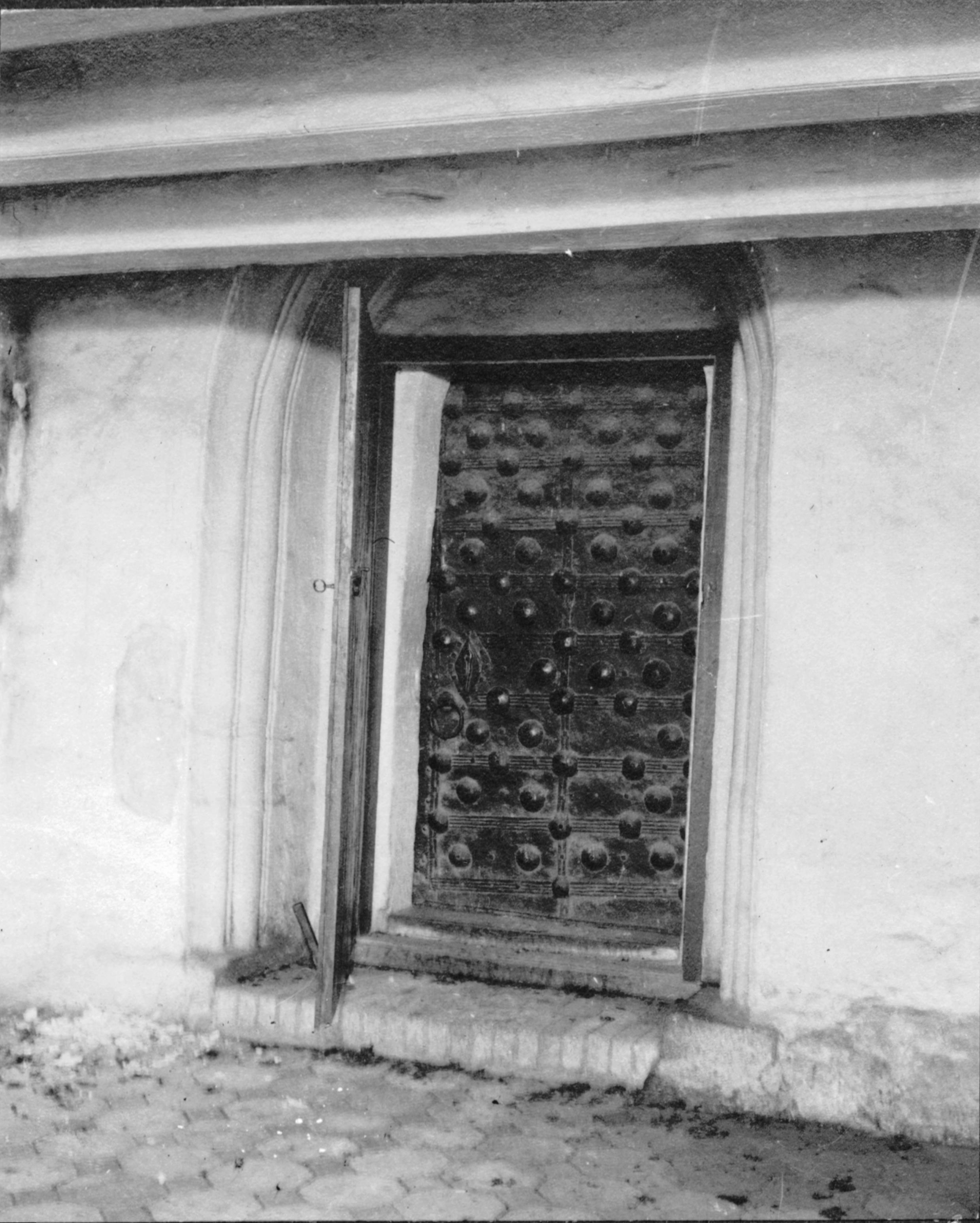 Norra dörren. Beslagen med järnplåt med järnband och nitar över hela dörren. Från 1100-talet.
