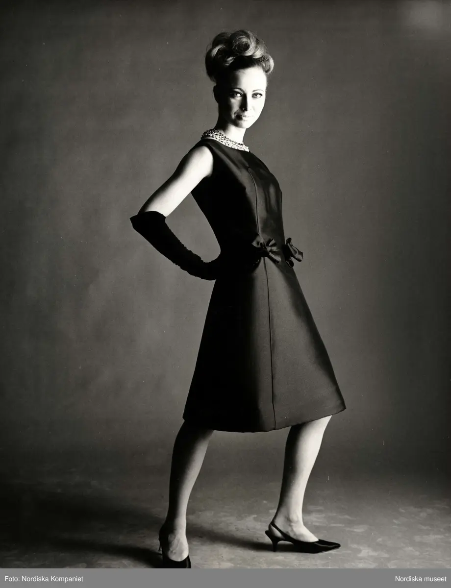 NK:s Franska damskrädderi, mannekäng i klänning från Jean Patou, långa handskar och pumps.