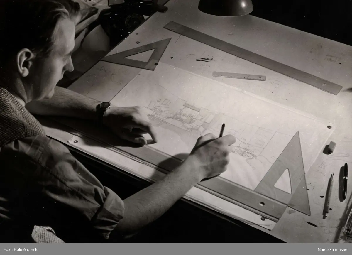 Man vid ritbord arbetar med skiss av möblerad hemmiljö, Nordiska Kompaniet i Stockholm.
