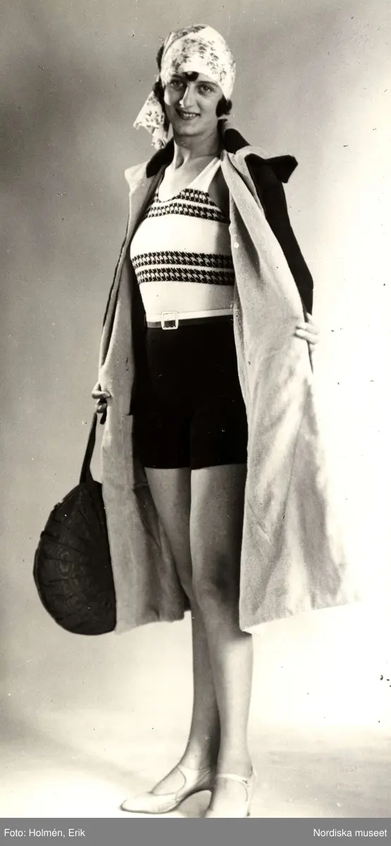 Dammode, Nordiska kompaniet. Modell i baddräkt. Baddräkt av grov ylletricot, röda byxor, vit överdel med röda ränder. Badväska av bomullsmoiré, gummifodrad, kan användas som kudde på badstranden. Kappan av moccatyg fodrad med frotté.