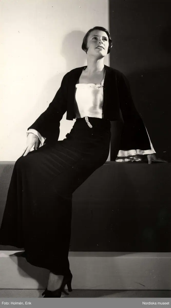 Dammode. Visning av Nordiska Kompaniets höstkläder den 16 september 1933. Kvinnlig modell i mörk kort jacka med vida ärmar nertill, ljust linne under. Lång mörk kjol