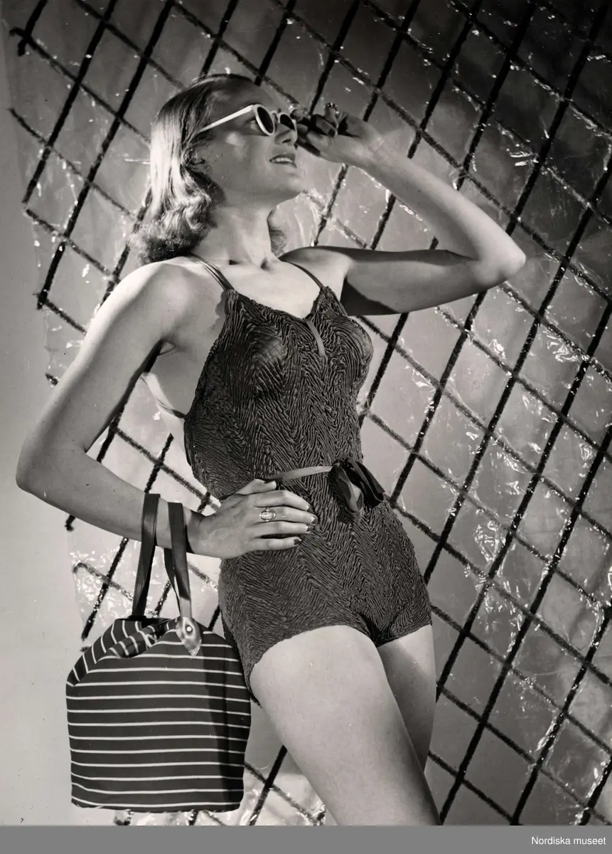 Dammode från varuhuset Nordiska Kompaniet i Stockholm 1944. En modell poserar i krinklad baddräkt med knytskärp i midjan.Hon bär solglasögon och över armen hänger en liten strandväska.