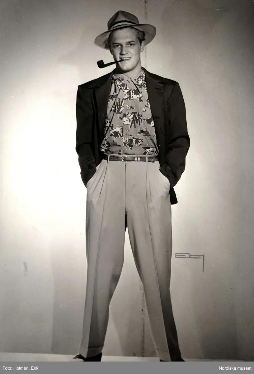 Manlig modell iklädd gabardinbyxor, mörk jacka, mönstrad skjorta, hatt och pipa i munnen. Utställningen California, NK (Nordiska Kompaniet) i Stockholm maj 1947.
