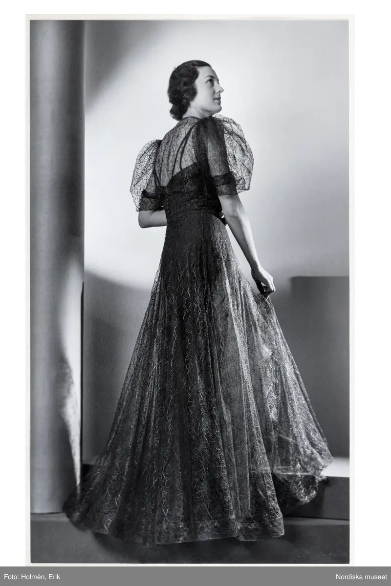 Mannekäng visar festklänning med ryggen i fokus. Underklänning enfärgad, figurnära med tunna axelband. Övre klänning med kort puffärm och hellång utställd kjol av mönstrad tyll. NK:s Franska damskrädderi.
