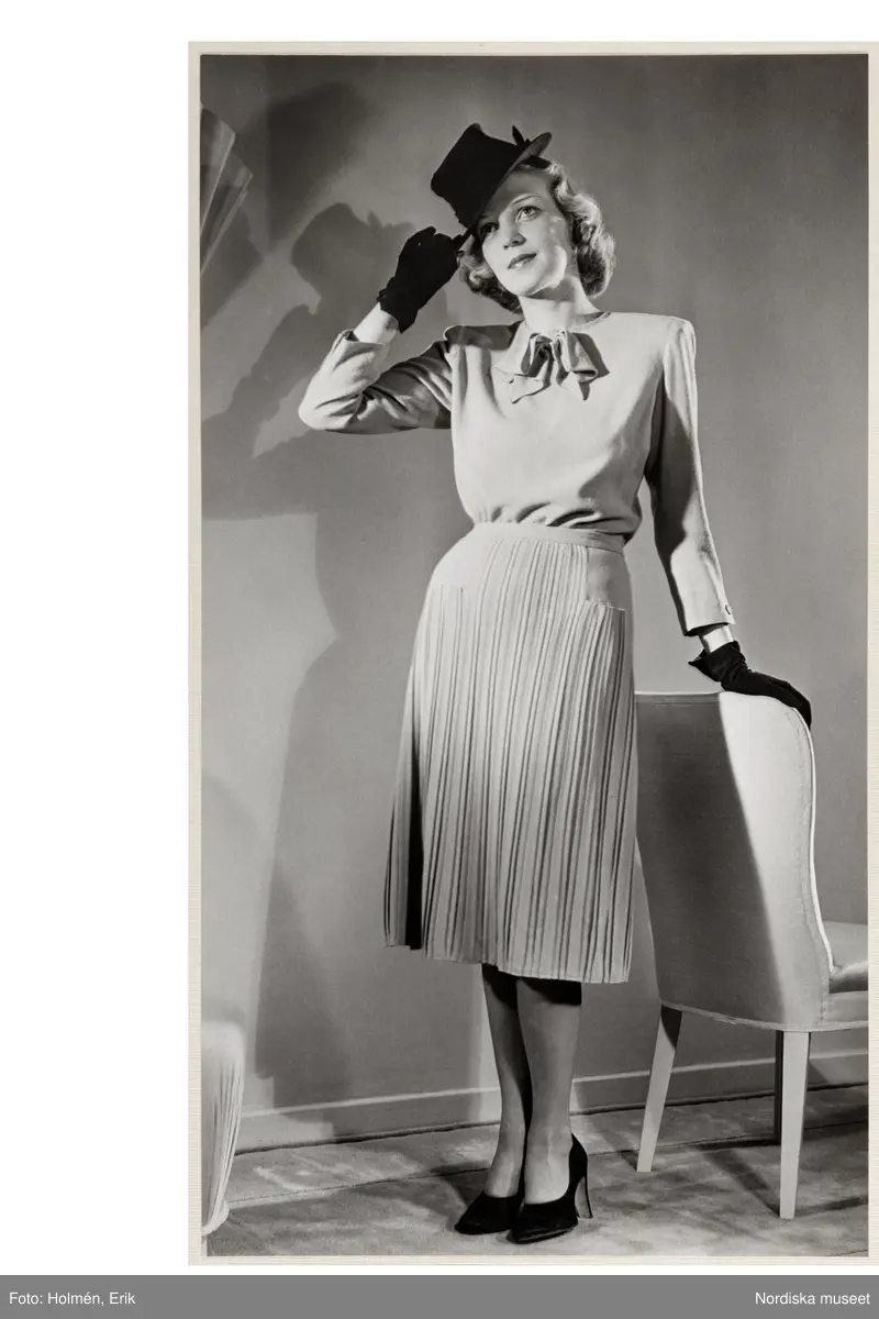 Mannekäng visar plagg i provrum. Klänning, överdel slät med lång ärm, rund hals med rosett samt markerade axlar. Knälång, plisserad kjol. Hatt, handskar och pumps. NK:s Franska damskrädderi.