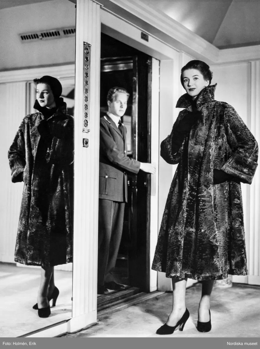 Mannekäng visar päls från NK:s Franska damskrädderi vid varuhusets hiss, den mytomspunna guldhissen. I den öppna dörren står en hisspojke i uniform. Persianpäls med uppslagen krage, vid, vadlång modell.