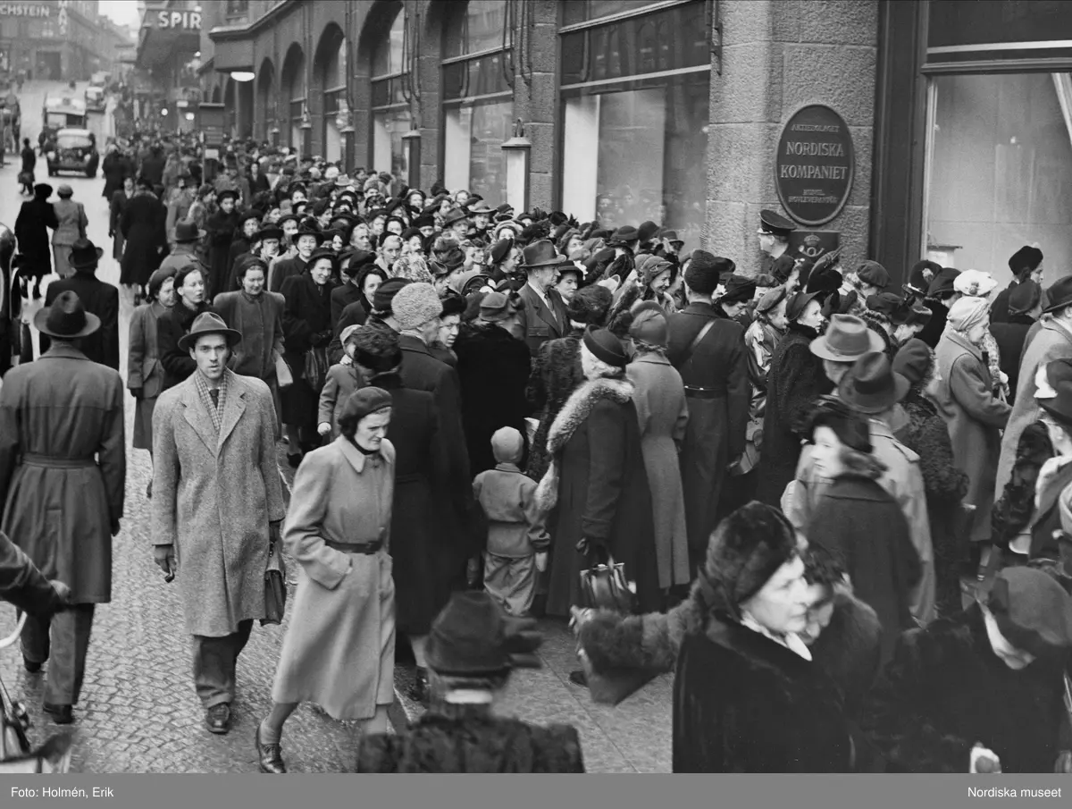 Kö till realisation på Nordiska kompaniet. "Det kan ibland vara sådan tillstötning av kunder till NK att polisen måste hjälpa till att ordna köerna."