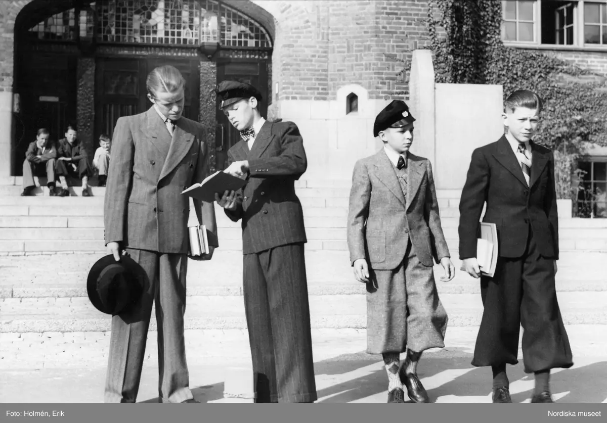 Gosskonfektion för skolungdom från Nordiska Kompaniet. Några unga pojkar klädda i kostym eller knäbyxor med kavaj poserar på Östra reals (vid tiden Högre allmänna läroverket å Östermalm) skolgård i Stockholm.