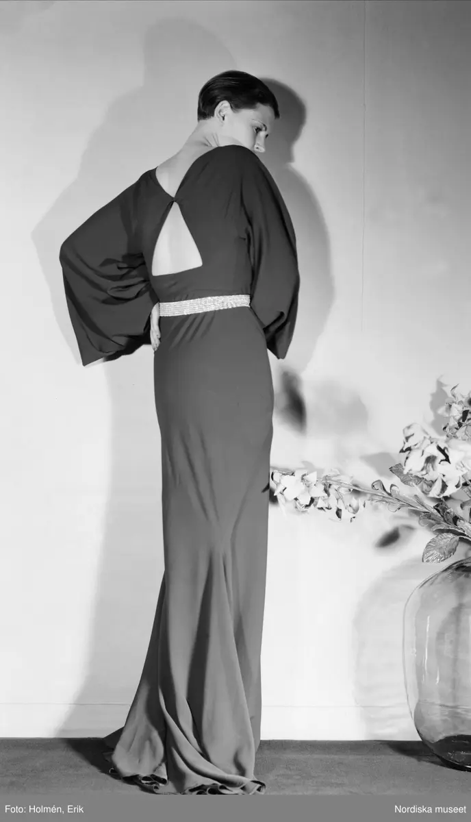 Modell visar ryggsidan på en långklänning. Nordiska Kompaniet.