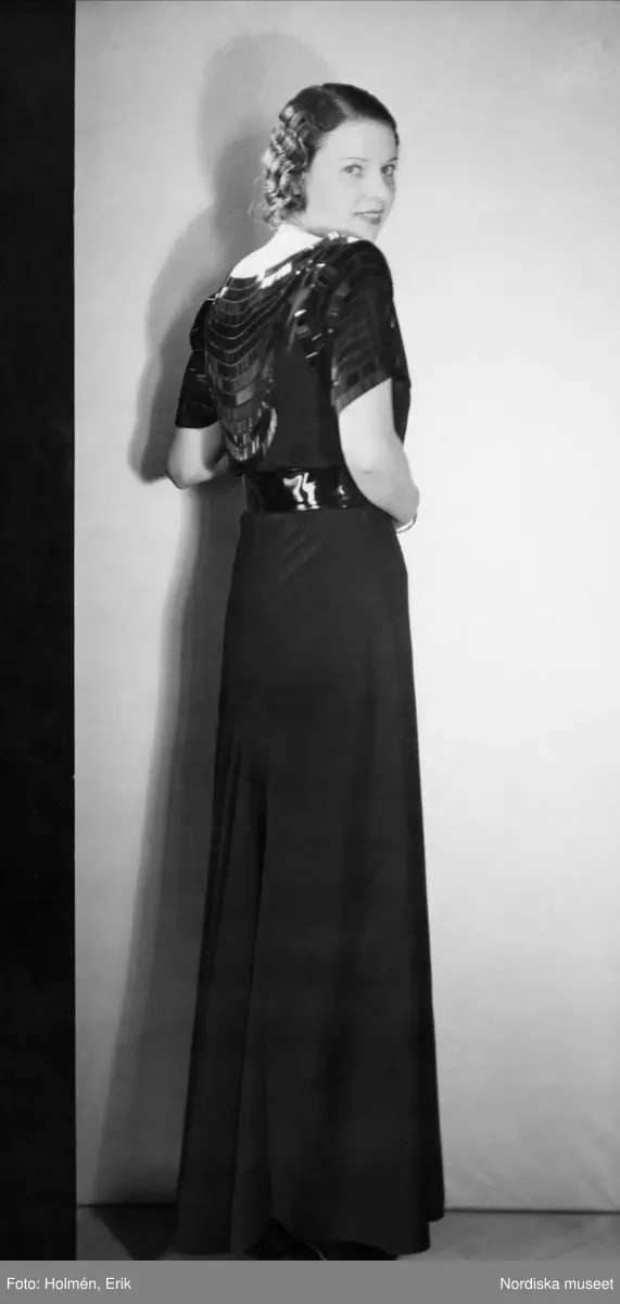 Modell visar ryggsidan på en långklänning. Nordiska Kompaniet.