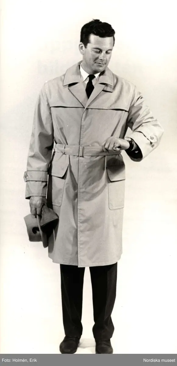 Manlig modell iklädd ljus kappa tittar på sitt armbandsur, håller hatt och hanskar i ena handen. Herrkonfektion på Nordiska Kompaniet i Stockholm.
