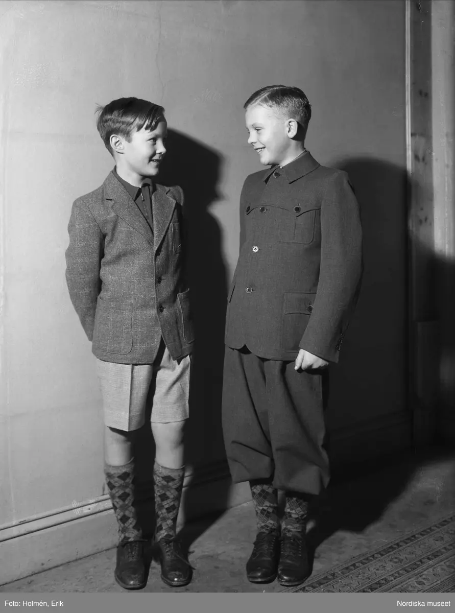 Reklambild för barnkläder "Som mor vill ha dem". Två pojkar i kostym. Nordiska kompaniets barnkonfektion.