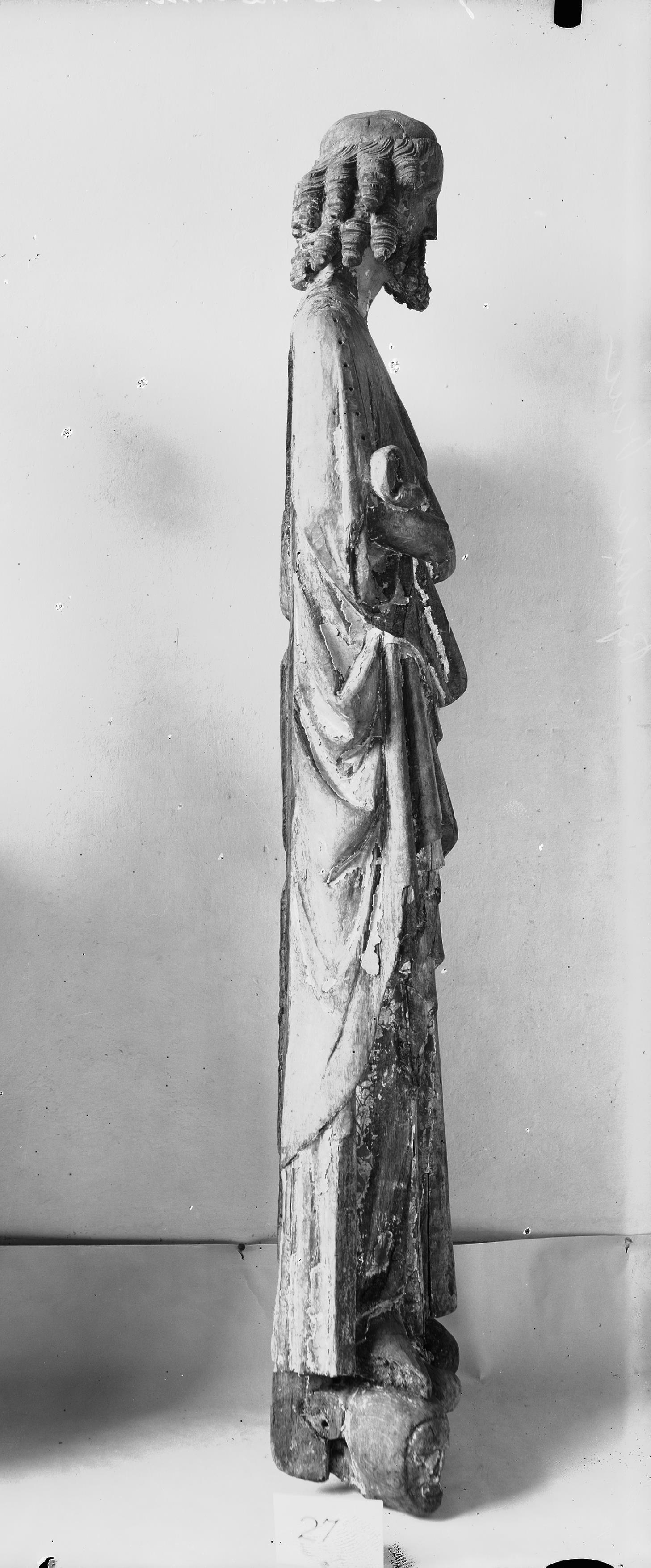 En skulptur av S:t Olof. Bild av ek: står på skalle. Bevarade rester av polykromin visar att manteln varit i guld med brokadmönster. Huvudet skulpterat runtom, ryggen urhålkad. Svenskt-franskt arbete från 1300-talets början (snabbinv). Saknar armar.