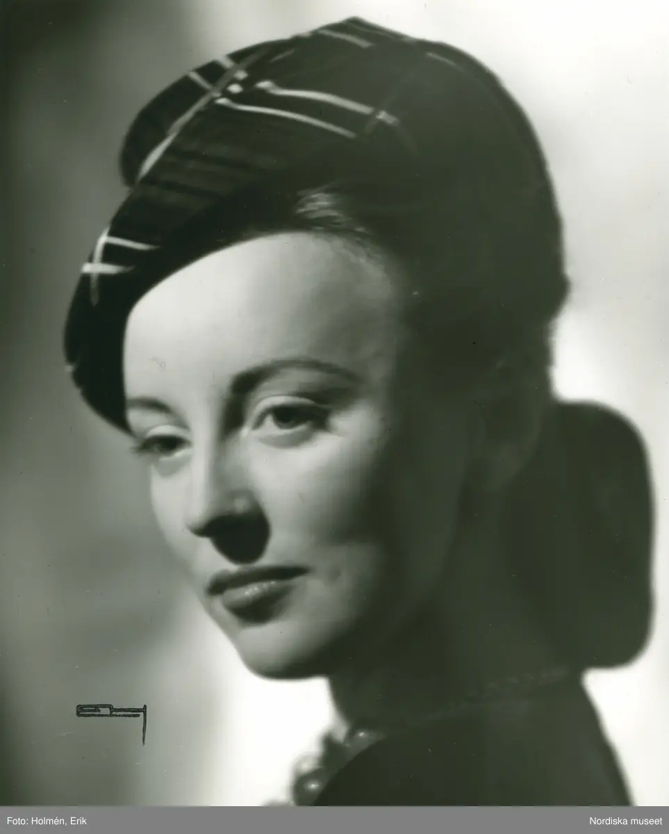 Porträtt av kvinna, möjligen modellen Hjördis Grundel-Starenius i hatt av Claude S:t Cyr.