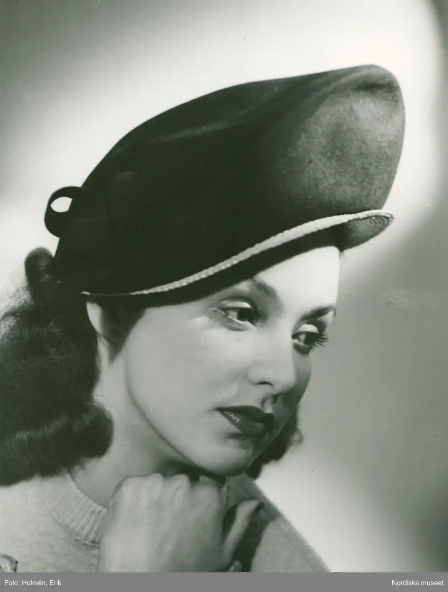 Porträtt av kvinna, möjligen modellen Hjördis Grundel-Starenius, i hatt med vit kant.