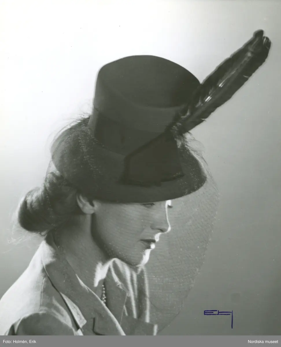 Porträtt av kvinna klädd i hatt med fjäder, flor och hattband, från Madame Suzy, samt kavaj och pärlhalsband.